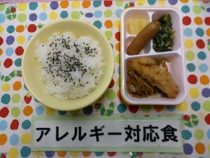 ご飯(ゴマ塩)、焼きそば、スティックチキン、ほうれん草とえのきの和え物、ウインナー、パイン缶