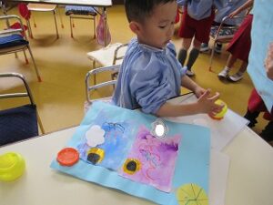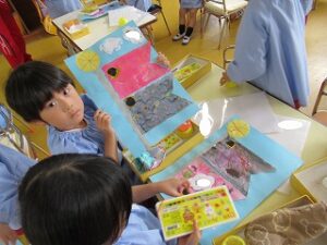 クレパスで描いた模様に絵の具を塗ると…綺麗に模様が浮き出します♪楽しそうです!