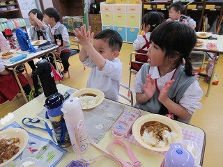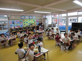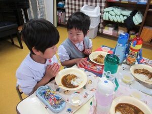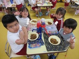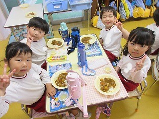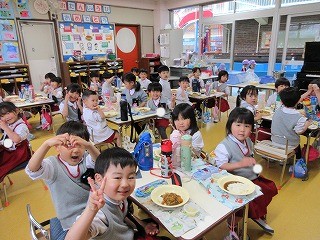 🍱今日ははじめての年中さんみんなでごはんを食べました。新しいお部屋、お友だちと一緒に食べるごはん、美味しかったね♪