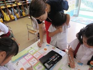 上手に書けているところを褒めてもらい、スタンプをもらうとニコニコ(^^)/