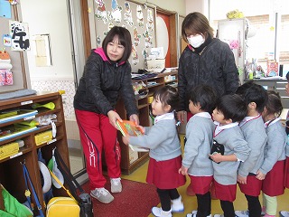 みんなで力を合わせて、次のクラスに絵本を運びます。