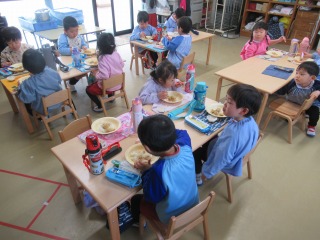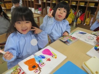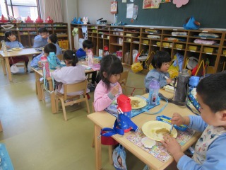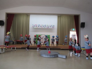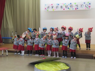 それぞれのクラスで作ったお気に入りのお面や衣装をつけてホールで披露してくれました(^O^)