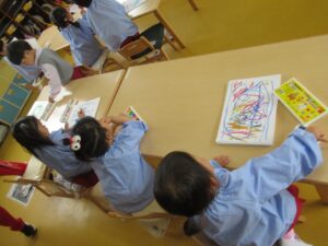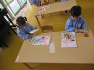 みんなで塗ったぬり絵の品物、おいしそうに食べる真似をしたり、お金はペットボトルのキャップ!